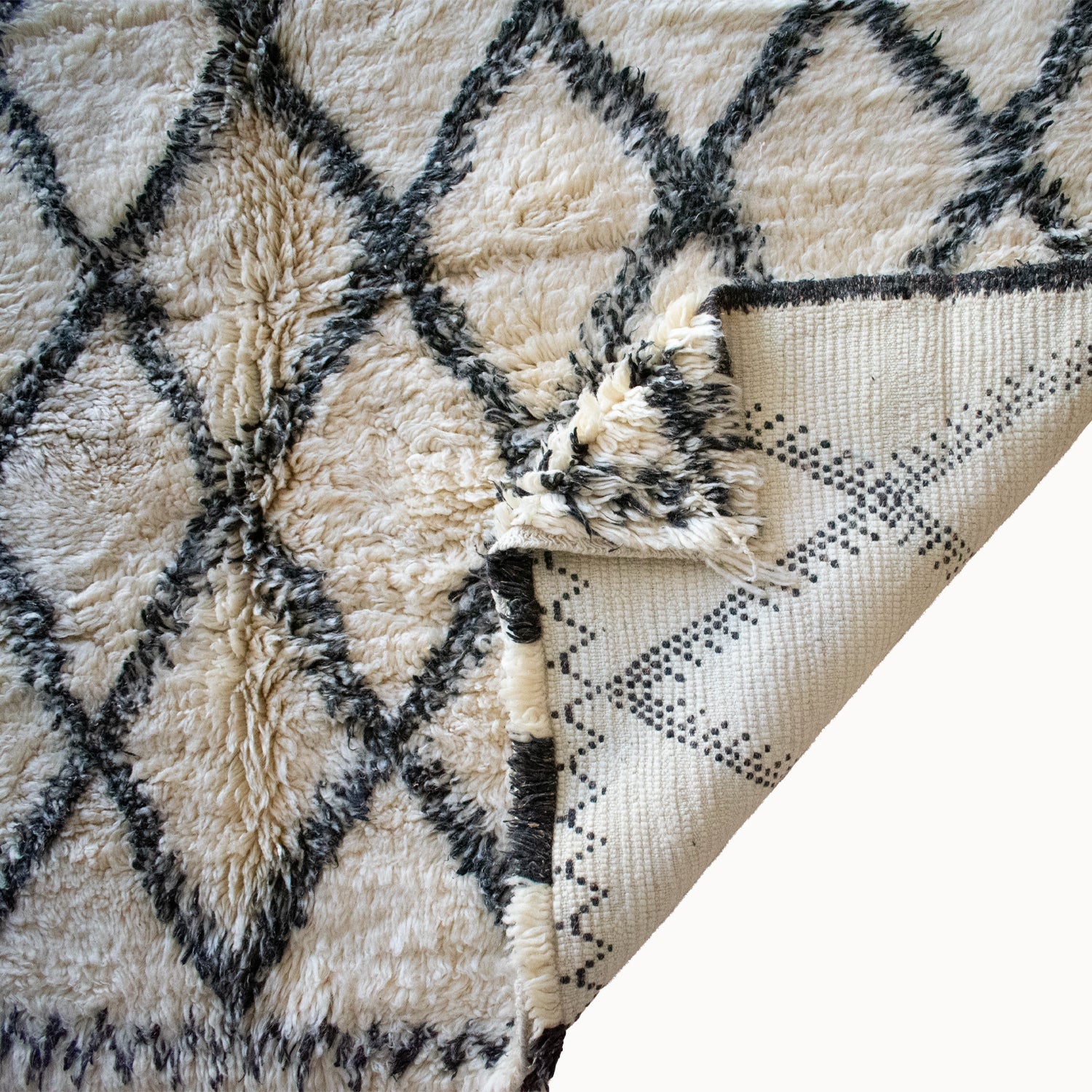 This vintage Moroccan rug carries the depth and presence that only time can create. Woven more than four decades ago, its bold black and white diamond pattern gives the piece a strong graphic identity while maintaining a sense of balance and restraint. The contrast anchors a room effortlessly, adding structure and visual rhythm without overwhelming the space. Hand-spun wool lends natural softness and subtle variation, creating a surface that feels rich, tactile, and inviting.